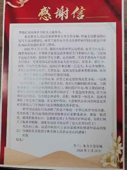 “太感谢你们了!没有你们的帮助,我真不知道该怎么办!”近日,来自在陕西省人民医院看病患者朱女士的家属,将一面印有“拾金不昧 品德高尚”的锦旗,满怀感激地递到西安体育学院保卫处人员王奇、沈清祥手中,对保卫处高效贴心的服务表示高度赞扬。