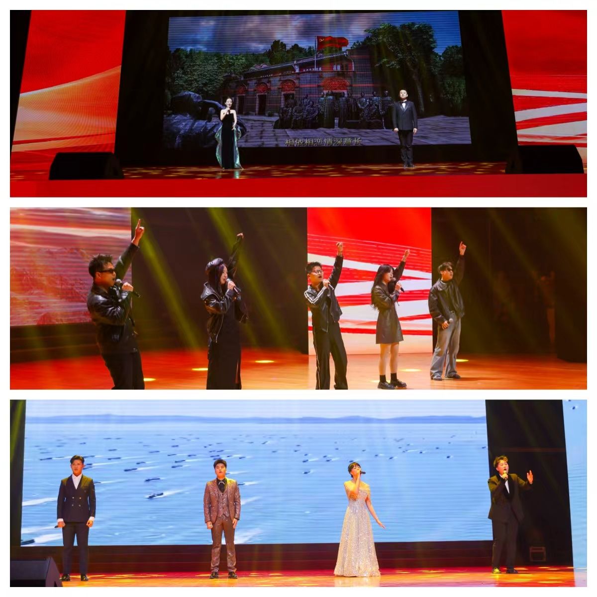 音乐教研室教师全程深度参与,为展演添彩赋能。刘默寒老师搭档舞蹈教研室娄山老师,联袂献唱《领航》,激昂嘹亮的歌声将对应篇章的氛围推向顶点;李韦璇老师悉心指导的歌曲《我的天空》,唱出了当代大学生的意气风发与蓬勃朝气;张艳、张惠两位老师倾力指导的压轴曲目《我爱你中国》,经由四名学生深情演绎,以满腔热忱礼赞祖国,为整场晚会画上圆满句号。