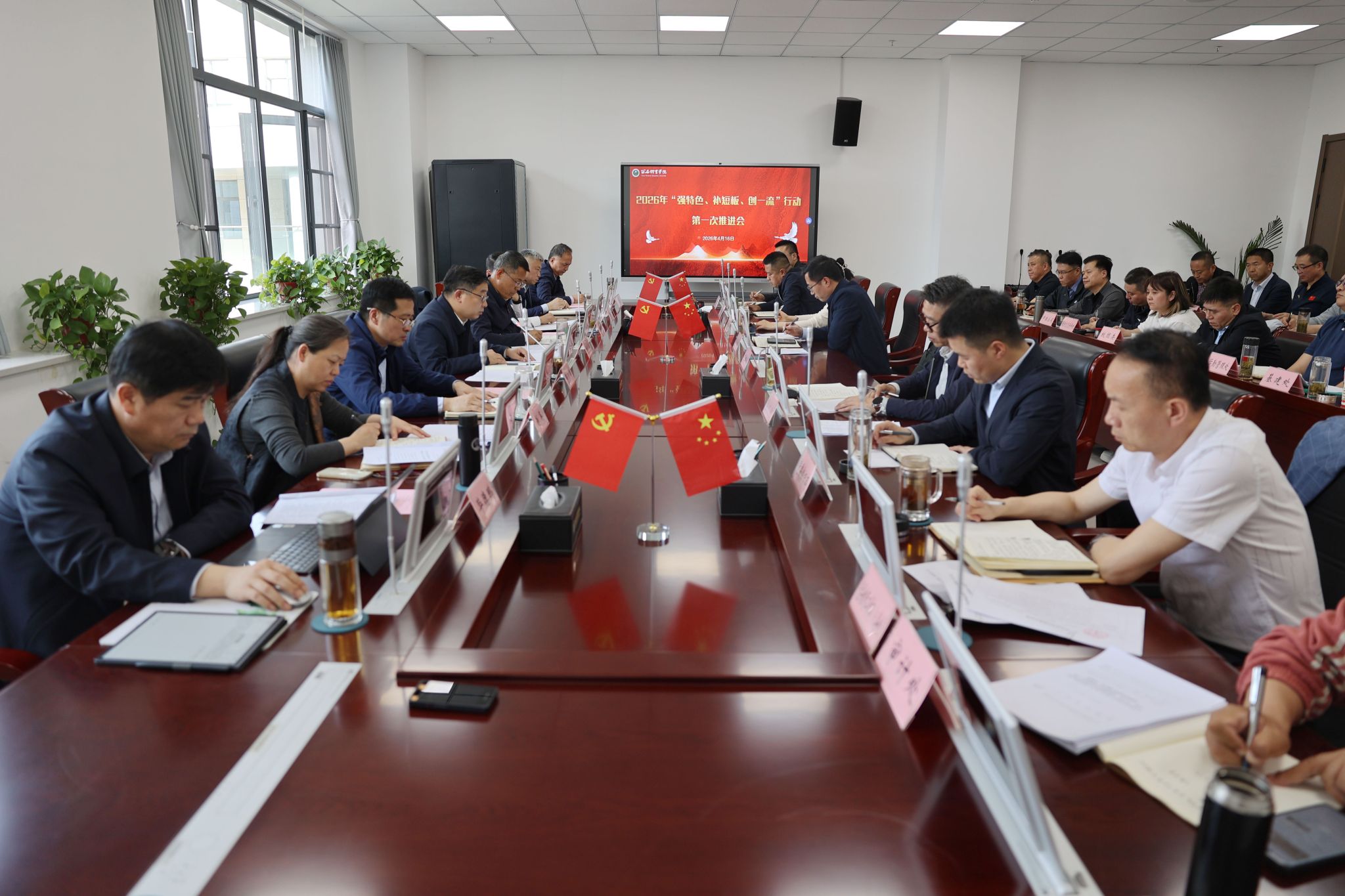 本网讯 为深入推动学校“强特色、补短板、创一流”行动年各项工作有力有序推进,清单化落实重点任务,着力破解发展瓶颈,夯实内涵根基,4月16日,党委书记刘子实主持召开2026年“强特色、补短板、创一流”行动第一次推进会并讲话。杨芳乾、张卫国、马海涛、谢英、张葆欣、毕德鹏、雷振华等校领导出席。各相关职能部门、二级学院党政主要负责人参会。
