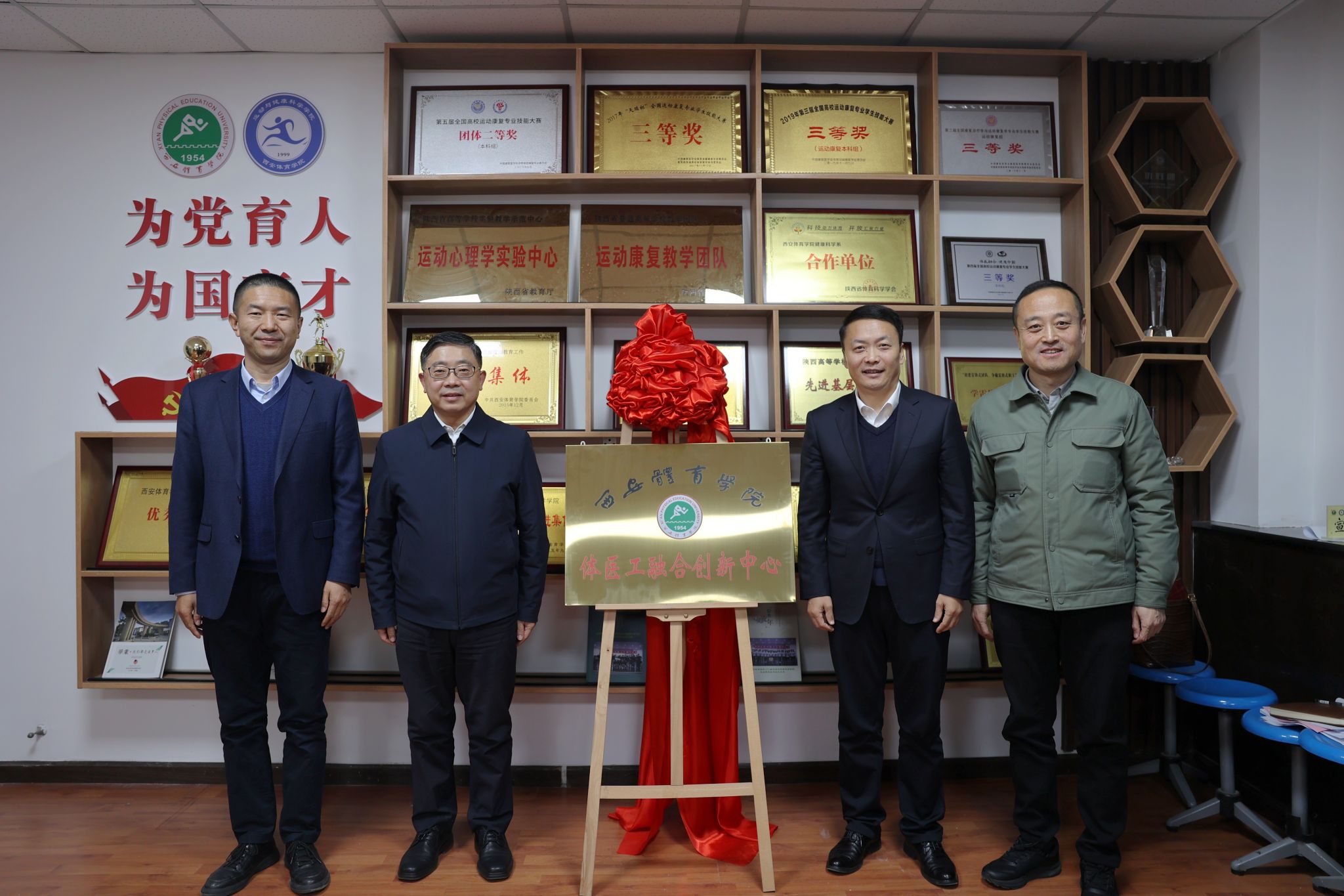 马海涛宣读关于成立西安体育学院“体医工融合创新中心”的文件。刘子实、马海涛、刘军、张鹏华为“体医工融合创新中心”揭牌。