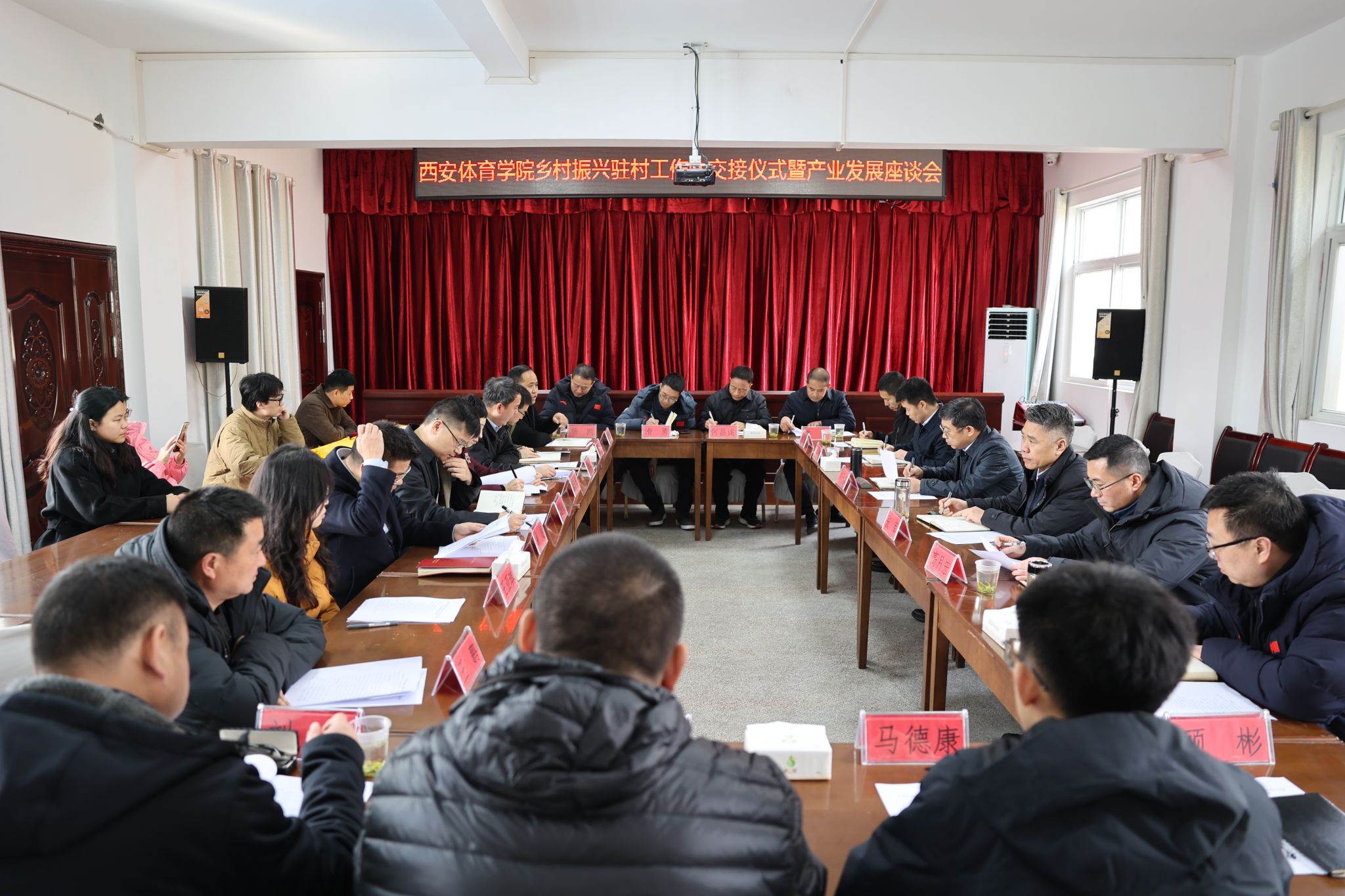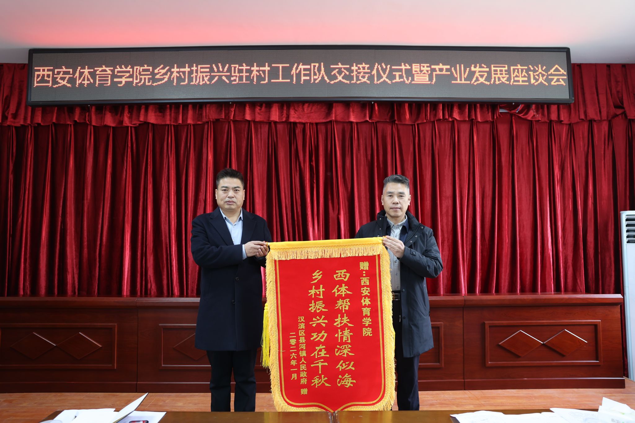 廖道琴、黄国俊代表汉滨区对西安体育学院长期以来对汉滨区的帮扶表示感谢,对老队员“把县河当故乡、把群众当亲人”的深厚情谊和务实作风给予高度赞扬,同时对新任驻村队员提出殷切期望:要俯下身子接地气,摸清村情民意,在融入乡村中找准工作定位;要扛起责任求实效,传承老队员担当实干精神,聚焦产业发展、基层治理、生态环境整治,发挥所长、创新突破,出实招、办实事、求实效;要凝聚合力促发展,当好西体与汉滨区协作的桥梁纽带,团结党员干部群众“心往一处想、劲往一处使”,凝聚多方合力推动乡村振兴。