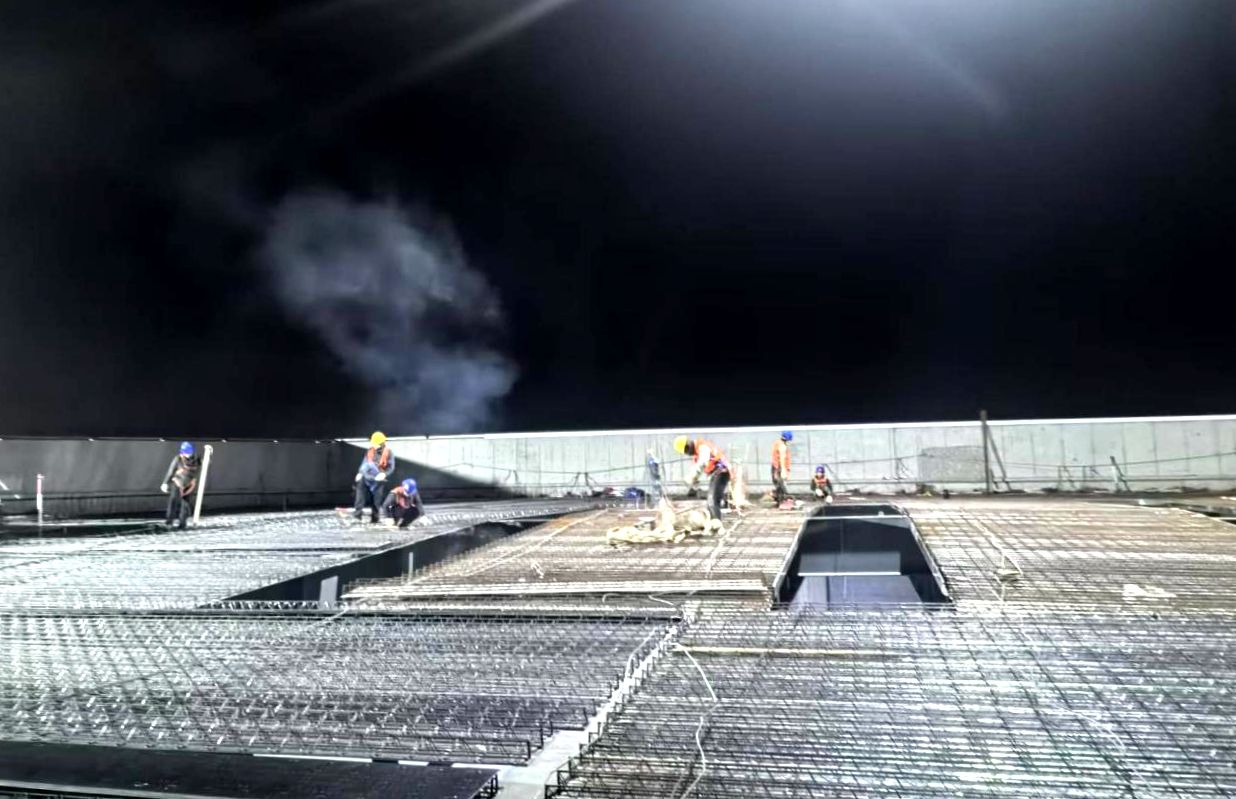 “抢工期不松质量,赶进度不忘安全。”建设单位科学制定夜间施工方案,实行轮班制度,明确各工序责任人与时间节点,实现混凝土浇筑、楼承板安装、栓钉焊接等工序无缝衔接。针对夜间施工特点,工地配备充足照明设备,确保作业面视线清晰;专职安全员全程旁站巡查,重点监控高空作业、动火焊接等关键环节,同时采取降噪防尘措施,在推进施工进度的同时最大限度降低对周边环境的影响。