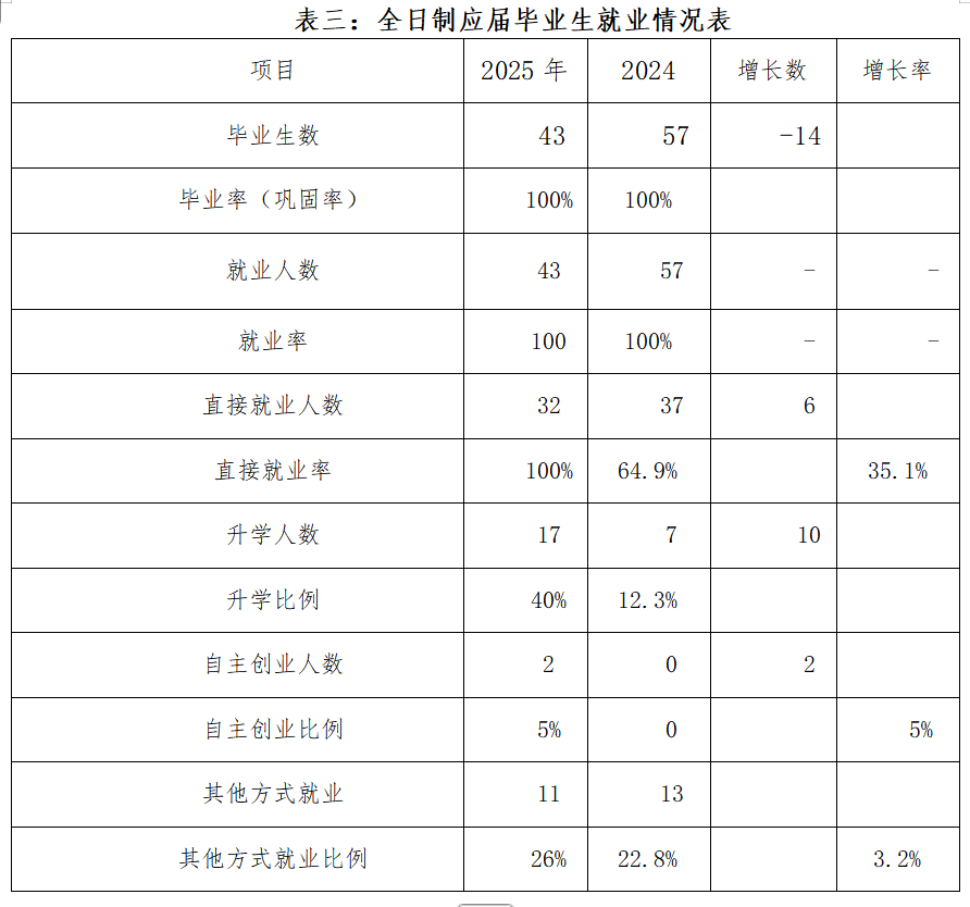 2025年应届毕业生43人,就业学生数为43人,平均就业率为100% 。直接就业人数32人,对口就业率74.4%。