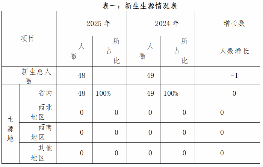 2.招生规模:2025年,学校共录取全日制新生48人,比2024年减少1人。按生源地分,新生生源地为省内:48人。具体情况见下表: