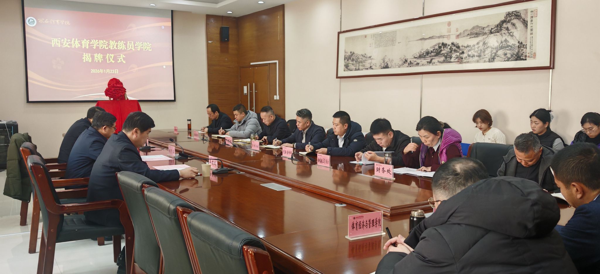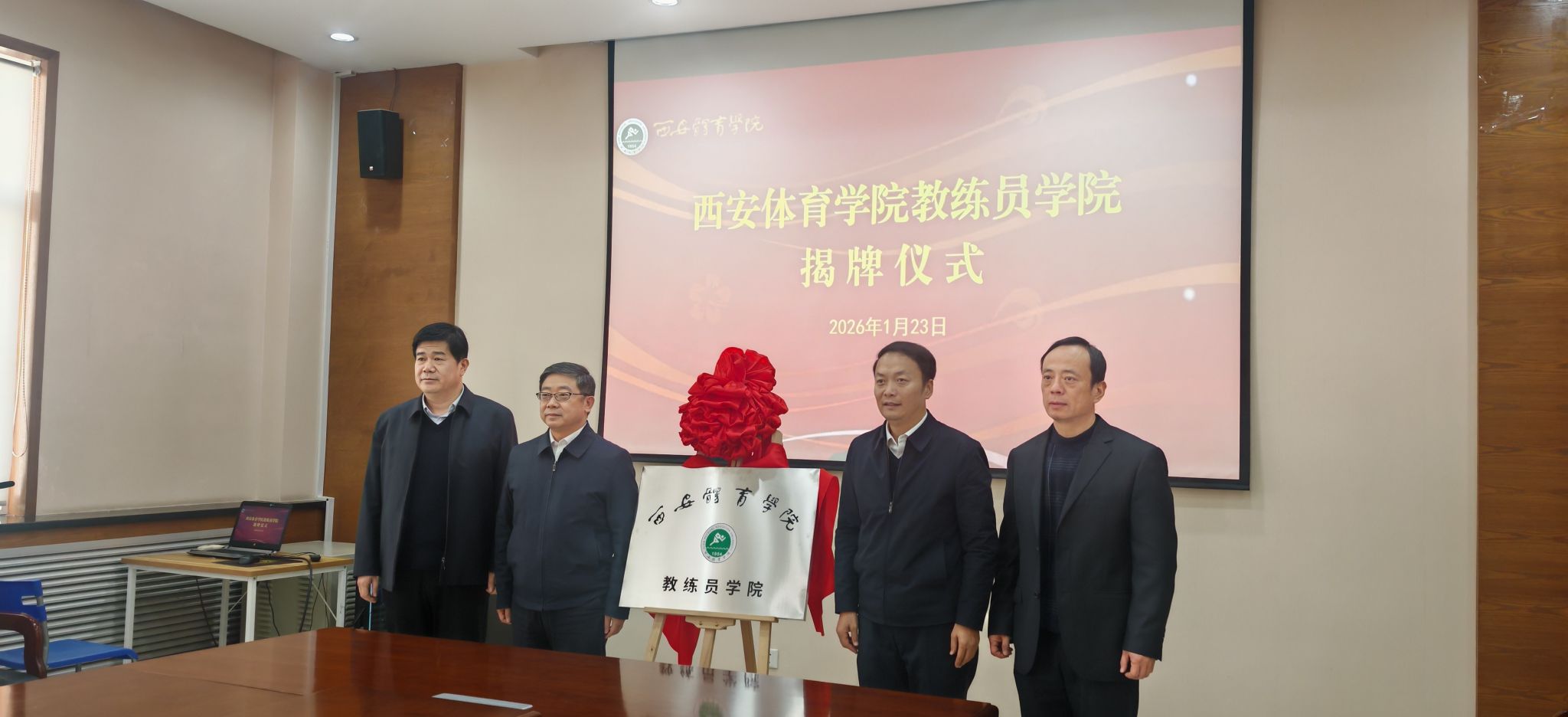 为深入贯彻体育强国、人才强国战略及《体育强国建设纲要》要求,优化办学布局,强化特色发展,助力陕西体育强省建设,1月23日下午,西安体育学院教练员学院揭牌仪式在含光校区2号行政楼举行。校党委书记刘子实、党委副书记马海涛、副校长毕德鹏出席仪式。揭牌仪式由副校长毕德鹏主持。