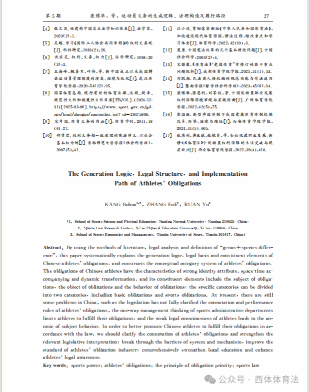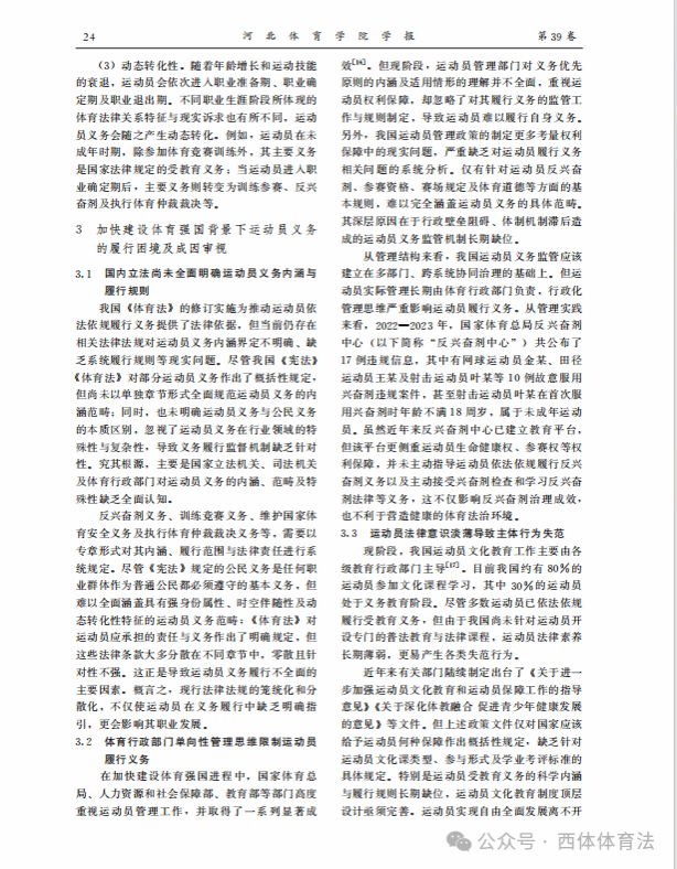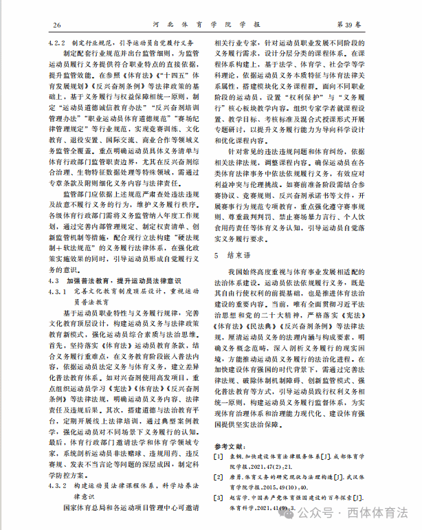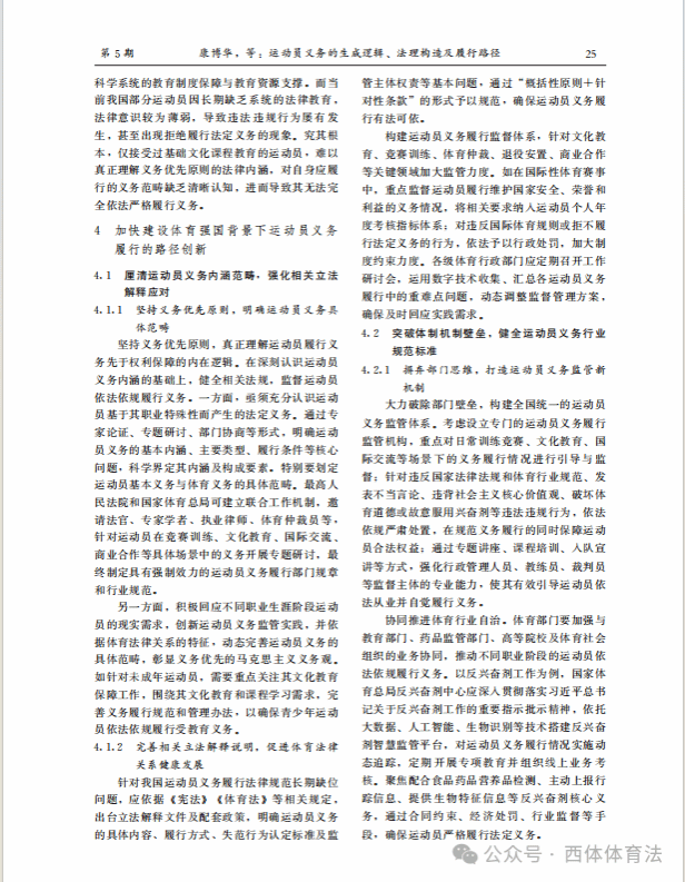 近日,西安体育学院体育法学研究中心研究员康博华在河北体育学院学报第五期发表了题为《运动员义务的生成逻辑、 法理构造及履行路径》研究成果。