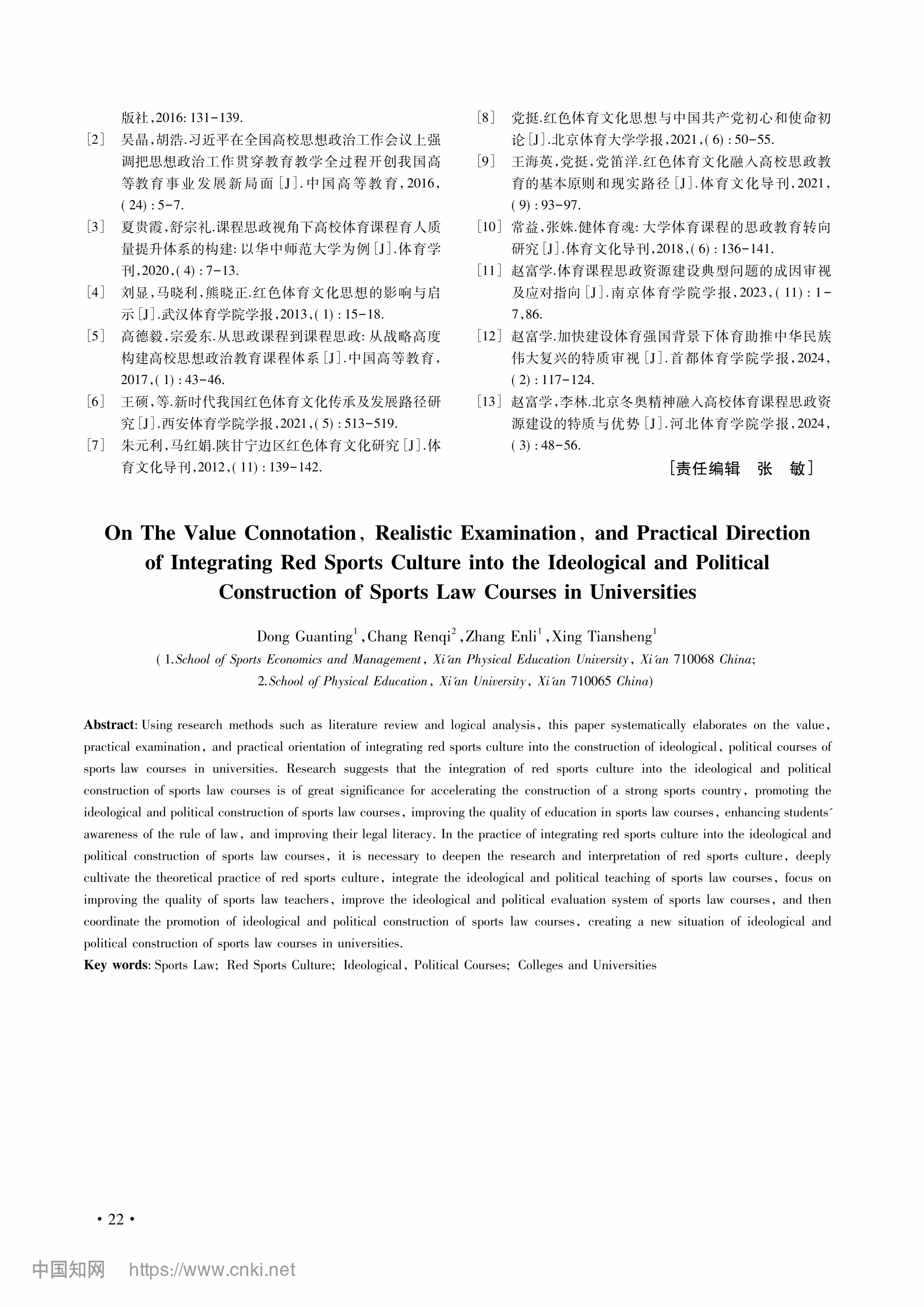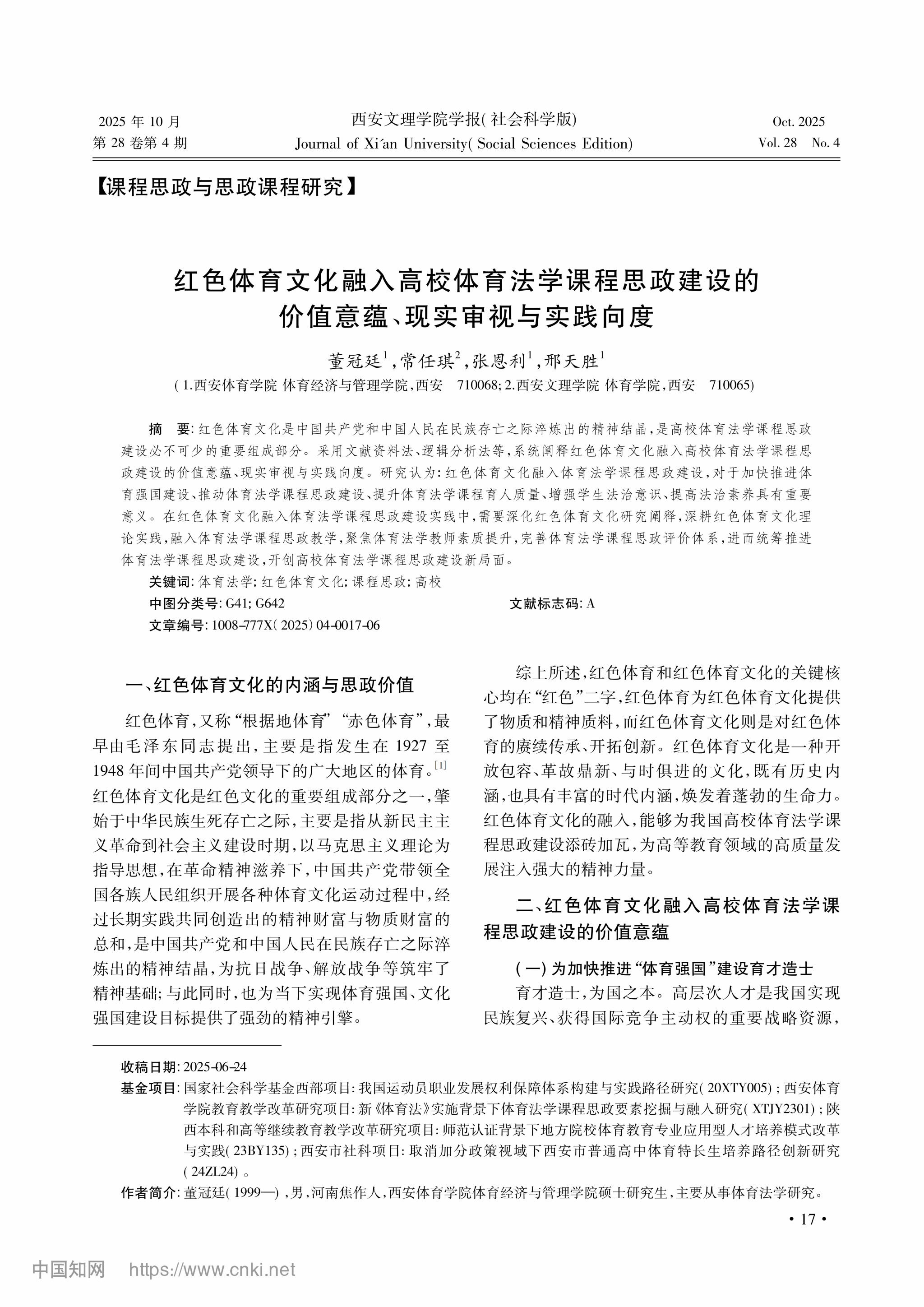 近日,体育法学研究中心张恩利教授团队在《西安文理学院学报》(社会科学版)发表了题为《红色体育文化融入高校体育法学课程思政建设的价值意蕴、现实审视与实践向度》的研究论文。该研究成果系西安体育学院2023年教学改革研究重点项目(项目编号:XTJY2301)的阶段性成果。