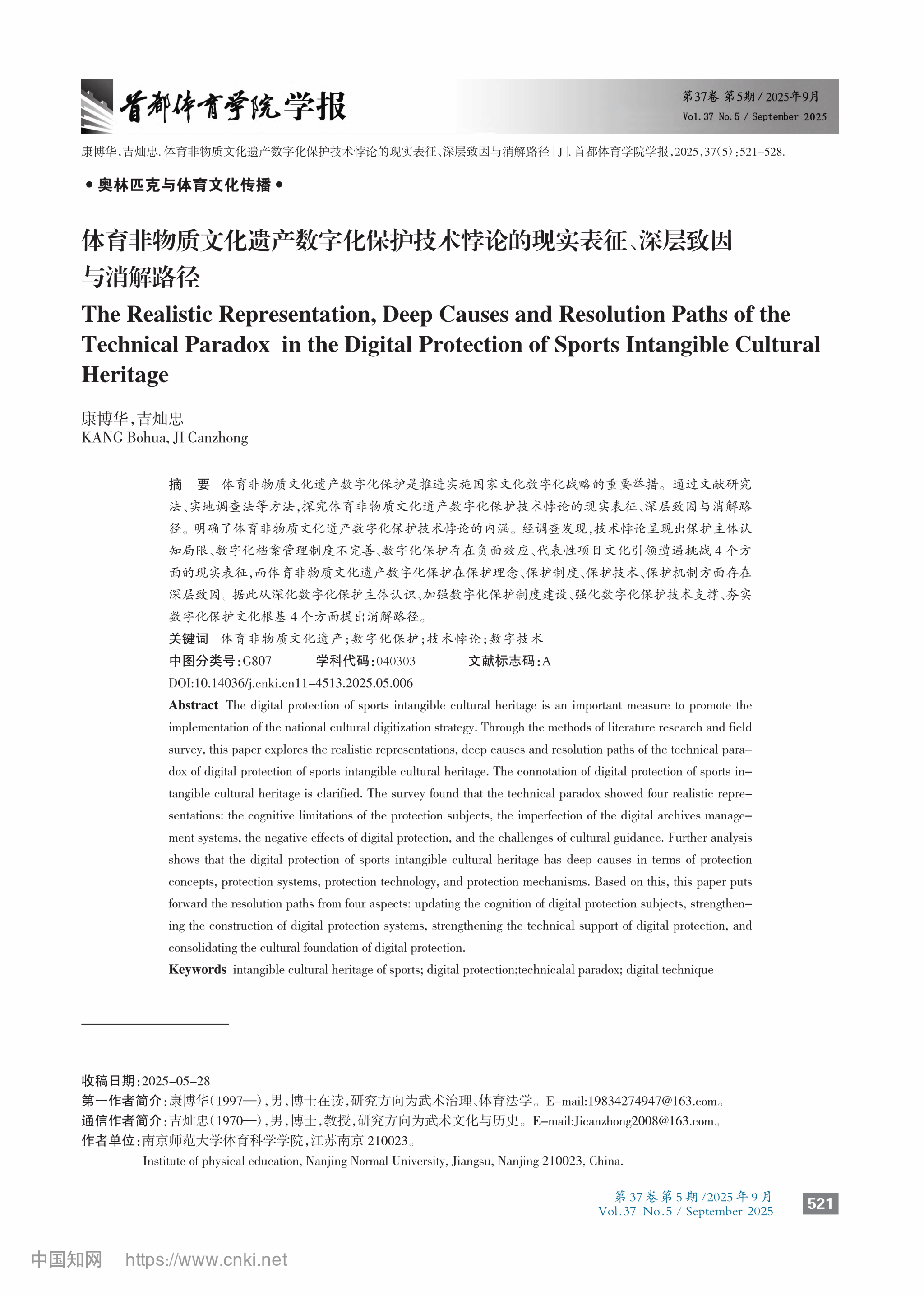 近日,西安体育学院体育法学研究中心兼职研究人员、南京师范大学体育科学学院博士研究生康博华在《首都体育学院学报》发表了题为《体育非物质文化遗产数字化保护技术悖论的现实表征、深层致因与消解路径》的研究成果。
