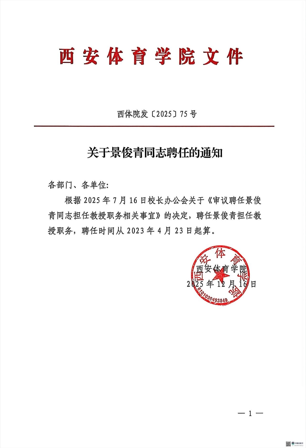 关于景俊青同志聘任的通知