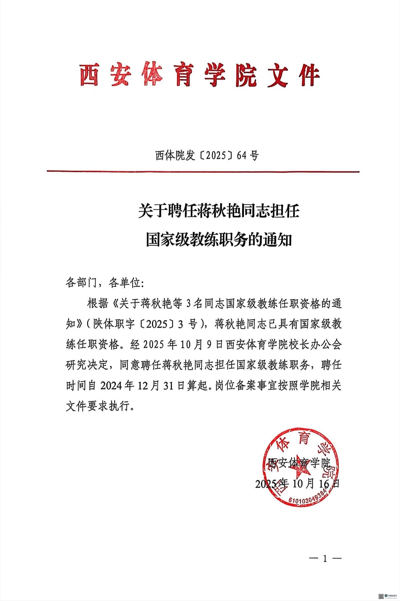 关于聘任蒋秋艳同志担任国家级教练职务的通知