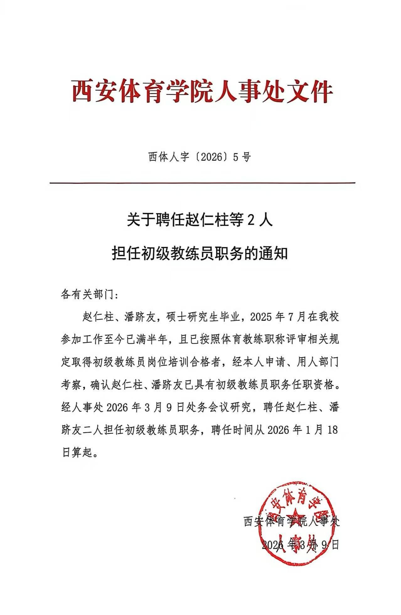 关于聘任赵仁柱等2人担任初级教练员职务的通知