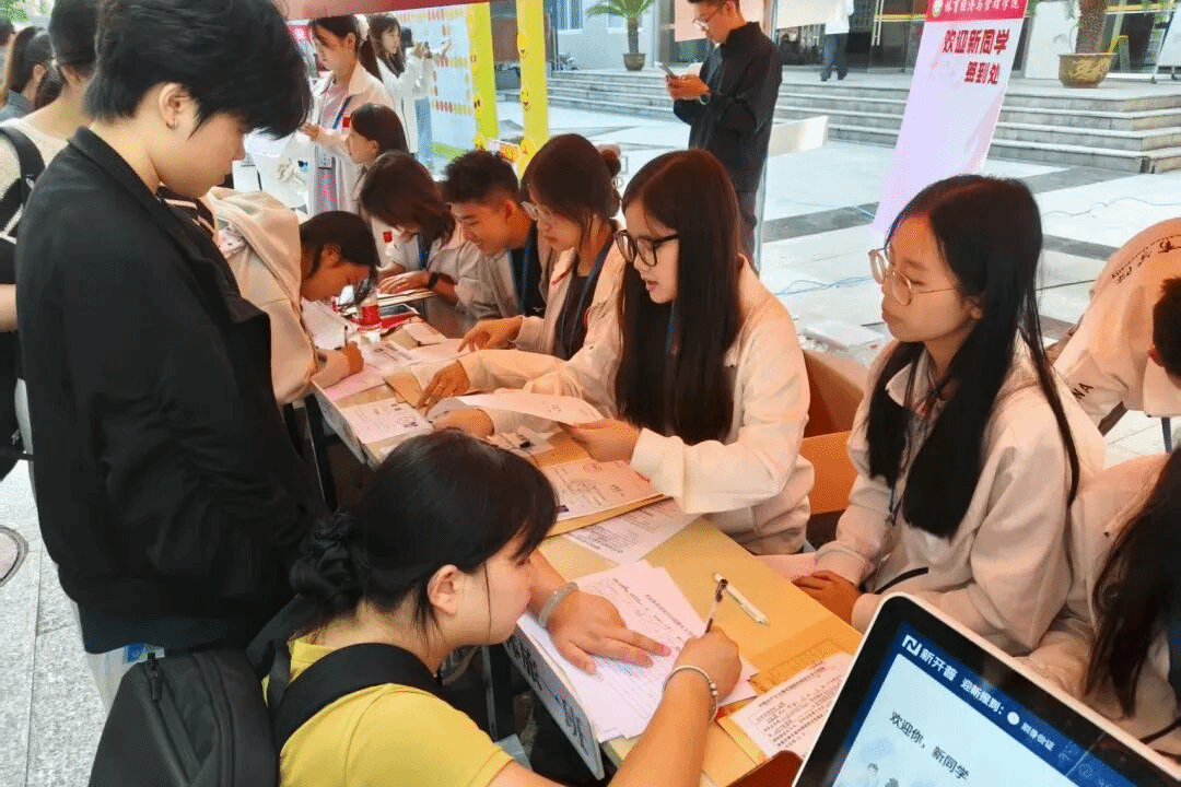 报到环节热烈而有序:志愿者细致办理入学手续,从信息核对到资料发放,每一步都一丝不苟;报到处特设的签到板,是新生们与这里的第一次对话,也藏着即将展开的无限可能;咨询处里,学长学姐耐心解惑,温馨画面随处可见。