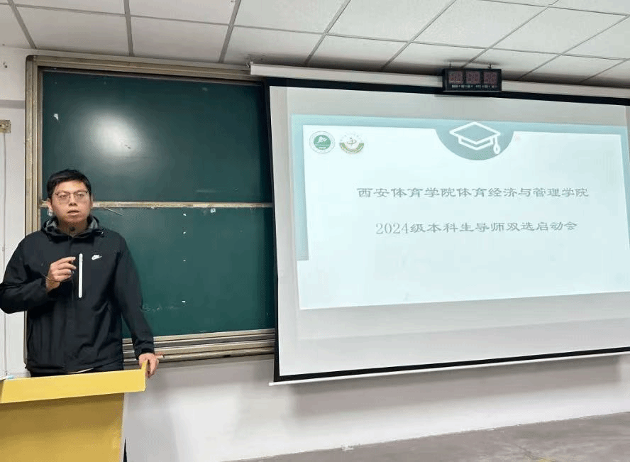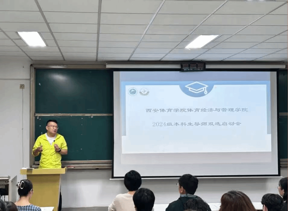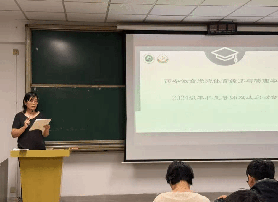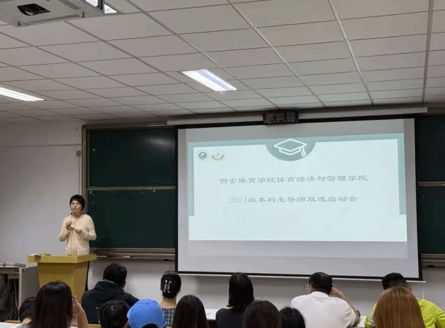 为深入推进本科生导师制,助力2024级本科生精准把握学业发展方向,西安体育学院体育经济与管理学院于2025年9月11日19时30分在含光校区教学楼201教室召开2024级本科生导师双选启动会。会议由鲁琼阳主持,学院党总支书记杨涛、院长王鹏、副院长丁建岚,经济学教研室主任张旻教授,管理学教研室副主任王欣副教授,市场营销教研室主任李雪丽老师参加,为2024级本科生开启导师双选的“导航”之旅。