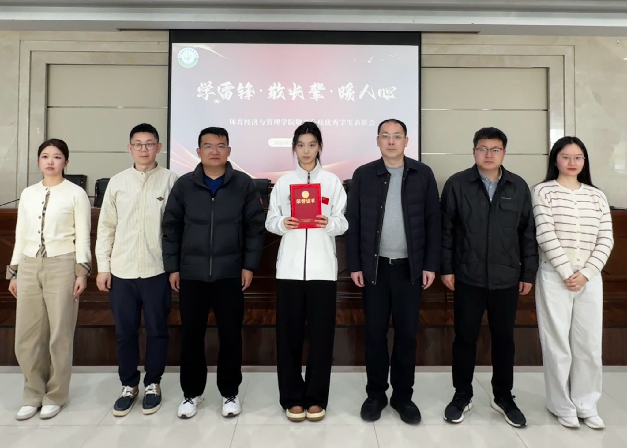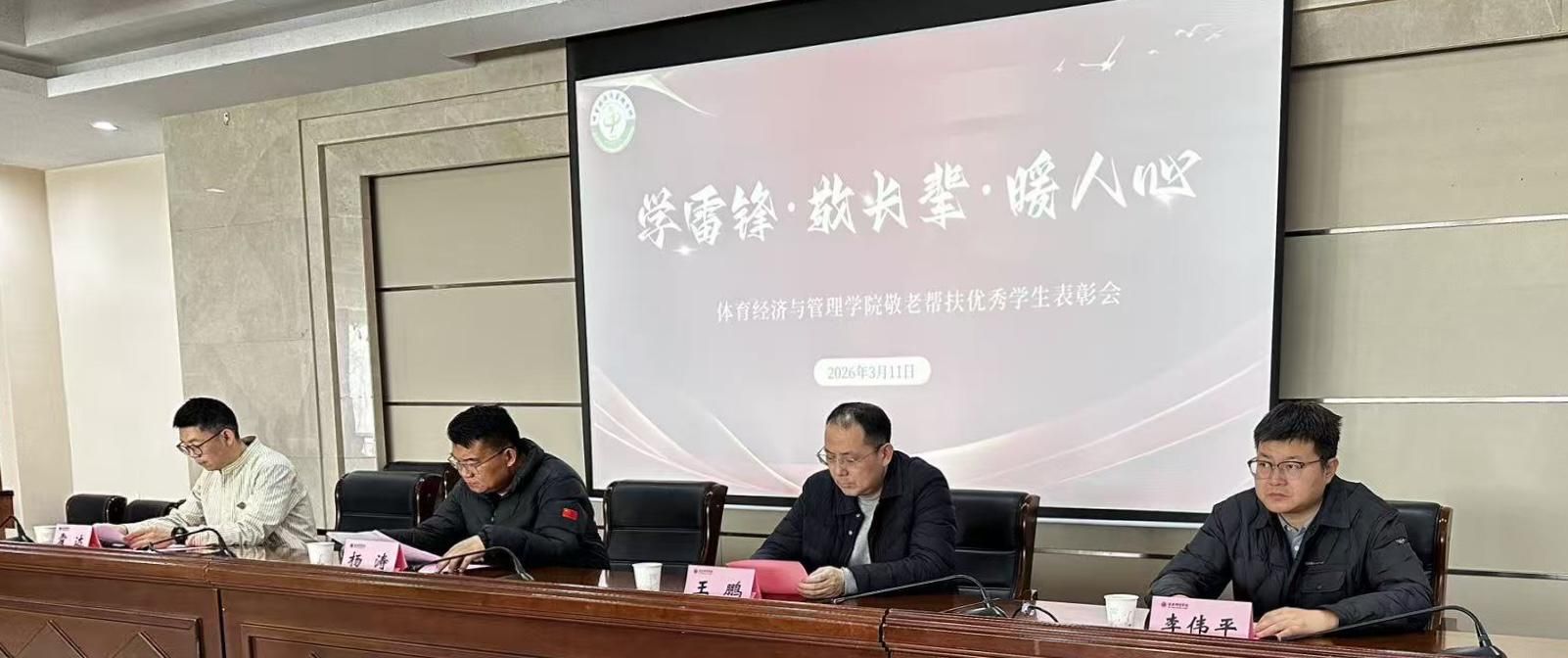 承雷锋之志,扬正义之风。体育经济与管理学院始终坚持立德树人根本任务,高度重视青年学生思想道德建设与精神文明培育,积极引导广大青年学子在实践中践行社会主义核心价值观。为大力弘扬新时代雷锋精神,表彰先进、树立榜样,营造崇德向善的良好校园风尚,体育经济与管理学院于2026年3月11日14时在含光校区2号行政楼六楼报告厅隆重召开“学雷锋·敬长辈·暖人心”敬老帮扶优秀学生表彰会。出席本次会议的有体育经济与管理学院党总支书记杨涛、体育经济与管理学院院长王鹏、体育经济与管理学院副院长李伟平、体育经济与管理学院学工办主任霍达、体育经济与管理学院辅导员鲁琼阳、兼职辅导员党昭、优秀学生薛晗 及学生代表,会议由体育经济与管理学院学工办主任霍达主持。