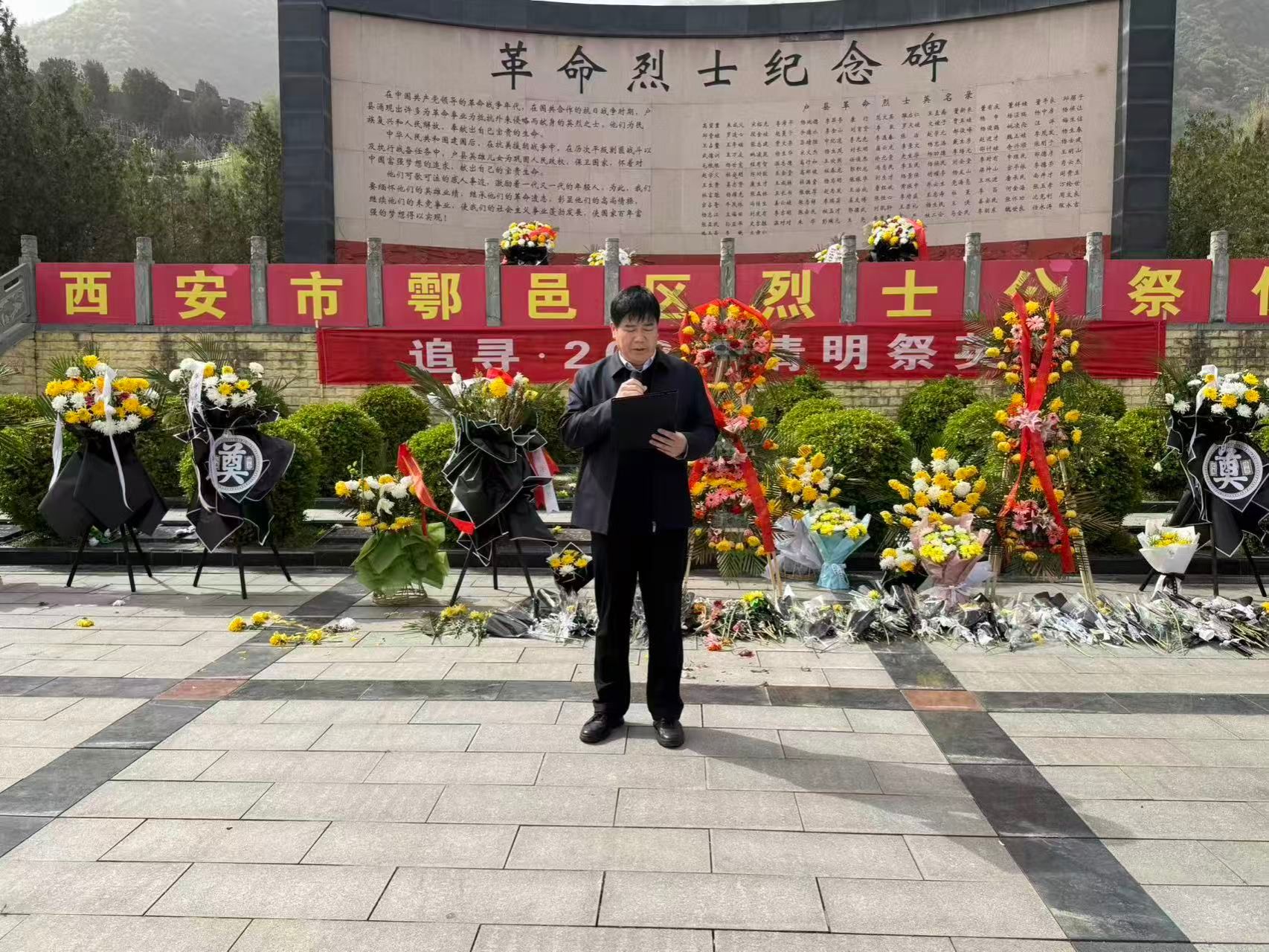 上午10时,仪式在烈士纪念碑广场正式开始。全体人员肃立,向为民族独立和人民解放事业英勇献身的烈士默哀一分钟。随后,副校长毕德鹏、院总支书记刘耀荣、支部副书记智文飞代表学院师生向烈士纪念碑敬献花篮,全体学生向烈士墓敬献鲜花,朵朵鲜花寄哀思,铮铮誓言慰英魂。