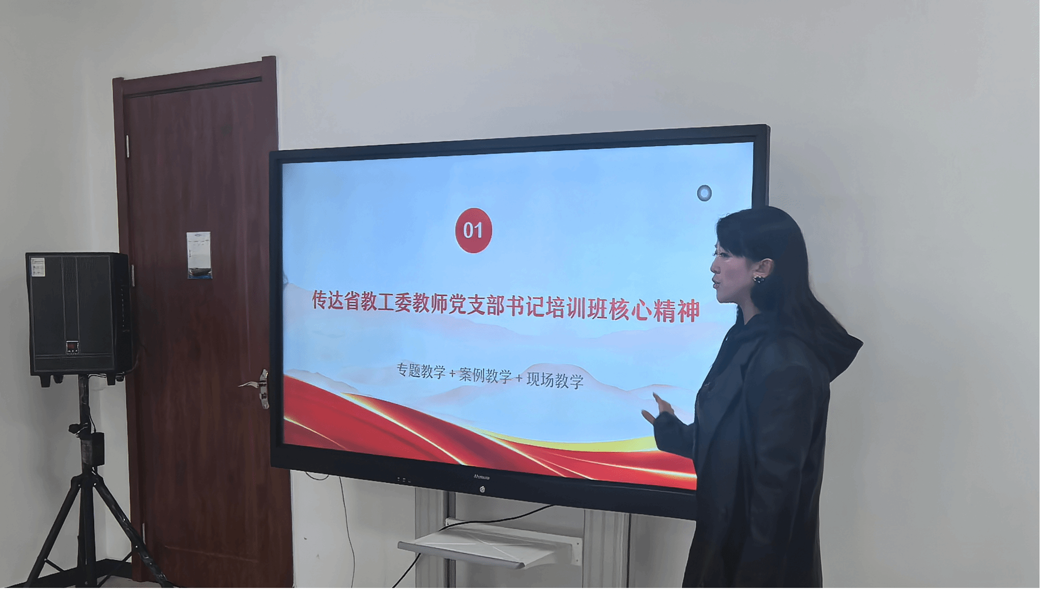 随后,苏珍珍同志结合教研室操舞项目特色,立足全员岗位实际,明确支部建设目标:对标省级样板党支部标准,提出“六个坚持+四个引领”党建工作模式 —— 以“坚持理论学习、制度执规、党课提质、党日赋能、典型引路”筑牢支部根基,以“党建引领教学创新、科研突破、竞赛提升、社会公共服务”推动党建与业务深度融合。同时,围绕“党建带动业务、党员带动全员”,部署全员参与任务,明确各岗位教师在支部建设中的具体职责与协作方向,凝聚共建合力。