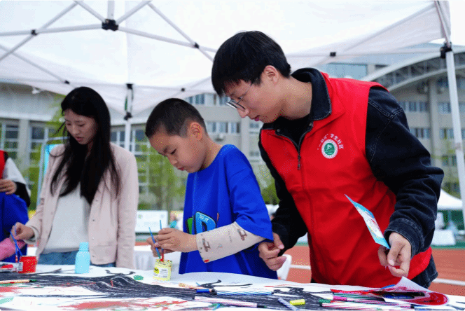 在大学生志愿者的带领下 ,小学生志愿者与孤独症孩子们一同围绕西安体育学院(含光校区)田径场奔跑。途中设置了 6 个趣味关卡 ,包括 “桥见长大” 、 “魔力转圈圈” 、 “魔法四季树” 等小游戏。游戏过程中 ,孤独症孩子与普通孩子不分彼此 , 团结友爱的场景让在场的家长们深受感动。尤其是 “魔法四季树” 环节 ,孩子们集体创作 ,在树干上 “ ⽣” 出叶子 ,所有人都开心地在画布上留下爱的印记。 五彩缤纷的图案与暖暖的春色完美融合 ,也深深印在了每一位参与者的心里。